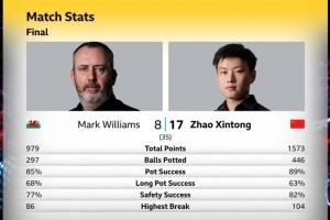 體育資訊5月5日訊 斯諾克世錦賽決賽第三階段結(jié)束,趙心童17-8領(lǐng)先馬克-威廉姆斯,以下是本場比賽目前為止的數(shù)據(jù)對比。
