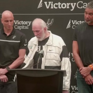 波波維奇中風(fēng)后首次公開露面,參加馬刺教練的交接儀式(波波維奇卸任后,馬刺主教練一職由代理主帥米奇-約翰遜接任)。