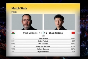 體育資訊5月6日訊 斯諾克世錦賽決賽第四階段,馬克-威廉姆斯開局后連追四局,目前以12-17落后趙心童。