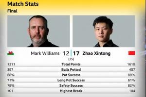體育資訊05月06日訊 斯諾克世錦賽決賽,趙心童vs馬克-威廉姆斯第四階段,上半場結(jié)束,趙心童17-12領(lǐng)先馬克-威廉姆斯。