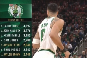 目前,塔圖姆已經(jīng)得到13分,他在凱爾特人的季后賽總得分來到2848分(賽前為2836分),超越保羅-皮爾斯,上升至凱爾特人隊史第五位,前一位是薩姆-瓊斯。