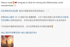 澳大利亞名將尼爾-羅伯遜在微博轉(zhuǎn)發(fā)了趙心童奪冠的報(bào)道,并配文寫道:“創(chuàng)造歷史????祝賀趙心童奪得2025斯諾克世錦賽冠軍!”
