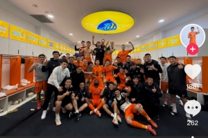賽后,孫學(xué)龍?jiān)谏缑綍癯鋈?duì)的慶祝合影并配文寫道:“永不放棄的精神 團(tuán)隊(duì)的力量兄弟們牛逼????”