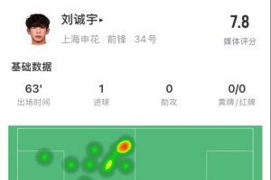 體育資訊5月6日訊 中超第11輪,申花對陣梅州客家,18歲劉誠宇首發(fā)出戰(zhàn)63分鐘,斬獲申花一線隊首球,獲評7.8分。