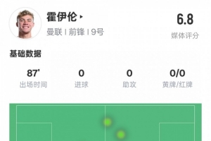 體育資訊4月18日訊 歐聯(lián)杯1/4決賽次回合,曼聯(lián)主場(chǎng)迎戰(zhàn)里昂。霍伊倫首發(fā)出戰(zhàn),0射門,總計(jì)13次對(duì)抗2次成功,送出3次關(guān)鍵傳球,評(píng)分6.8。