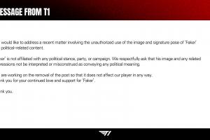 體育資訊05月06日訊 近期Faker選手的肖像/象征句式等出現(xiàn)在韓國政治相關(guān)的內(nèi)容中,T1俱樂部社媒發(fā)布公告,就此表達(dá)公司的立場。