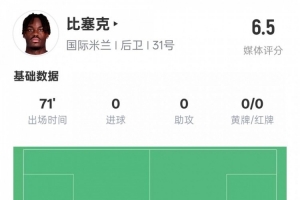 體育資訊5月7日訊 歐冠半決賽次回合,國(guó)際米蘭主場(chǎng)對(duì)陣巴薩,比塞克首發(fā)出戰(zhàn),貢獻(xiàn)5次解圍2搶斷,評(píng)分6.5。