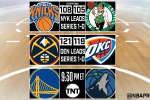 體育資訊05月07日訊 NBA季后賽次輪G1,步行者121-112擊敗騎士,尼克斯108-105擊敗凱爾特人,掘金121-119擊敗雷霆。