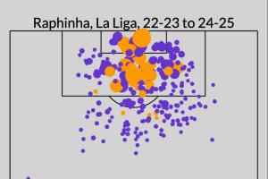 拉菲尼亞射丟的次數(shù)遠(yuǎn)高于進(jìn)球的次數(shù)。在2022-23賽季開始以來,歐洲五大聯(lián)賽中至少有50個進(jìn)球+助攻的36名球員中,僅有6人的預(yù)期進(jìn)球(xG)高于實際進(jìn)球。拉菲尼亞是唯一一個實際進(jìn)球比預(yù)期進(jìn)球少至少3個的球員,他落后4.4個:預(yù)期進(jìn)球33.4個,實際進(jìn)球29個。