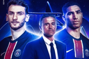 巴黎官方社媒發(fā)布了為此役制作的海報,主帥恩里克帶領(lǐng)阿什拉夫、克瓦拉茨赫利亞出鏡。