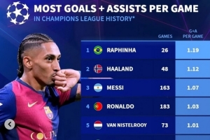 體育資訊5月7日訊 德國轉(zhuǎn)會市場統(tǒng)計了球員在歐冠場均參與進球的數(shù)量,并列出歷史排名,拉菲尼亞1.19球居首,哈蘭德、梅西、C羅前四。