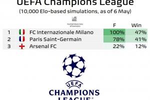 另一組半決賽,巴黎78%的概率進(jìn)決賽、41%的概率奪冠更被看好,而阿森納的晉級(jí)概率只有22%,奪冠概率為12%。