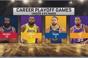 根據(jù)統(tǒng)計,這是哈登季后賽生涯第35場運動戰(zhàn)進球少于4個(即小于等于3),作為對比,詹姆斯有5場、庫里有3場、杜蘭特有2場。