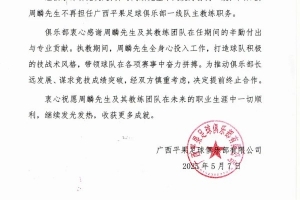 經俱樂部研究決定,并與周麟先生本人友好協(xié)商一致,即日起,周麟先生不再擔任廣西平果足球俱樂部一線隊主教練職務。
