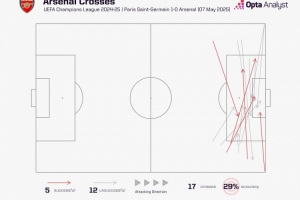 據(jù)Opta統(tǒng)計,阿森納本場比賽上半場嘗試17次傳中,超過阿森納本賽季歐冠全場比賽的平均傳中次數(shù)(15.6次)。