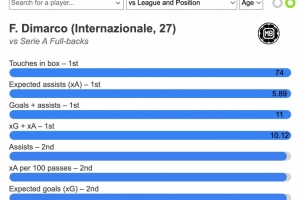 另外,迪馬爾科助攻、每100次傳球預(yù)期助攻、預(yù)期進(jìn)球在意甲邊衛(wèi)球員中排名第二位。