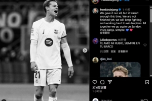 體育資訊5月8日訊 歐冠半決賽次回合,巴薩不敵國米遭淘汰,巴薩中場德容更新社媒談自己的感受。