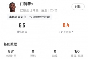 巴黎左后衛(wèi)努諾-門德斯比賽第88分鐘被替換下場,球員此役數(shù)據(jù)如下: