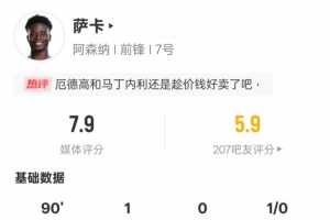 體育資訊5月8日訊 歐冠半決賽次回合,阿森納客場1-2巴黎圣日耳曼。薩卡首發(fā)出戰(zhàn),打進(jìn)1粒進(jìn)球,送出2次關(guān)鍵傳球,但也錯失1次進(jìn)球機(jī)會,評分7.9。