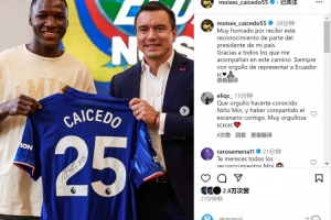 凱塞多社媒曬出與諾沃亞的合照,配文:“非常榮幸能夠從我國(guó)總統(tǒng)那里獲得這樣的認(rèn)可,感謝所有陪伴我走過(guò)這段旅程的人。始終以代表厄瓜多爾為榮?!?/p>