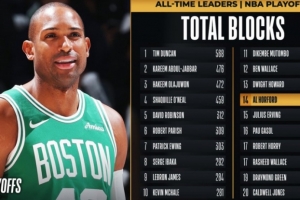 目前,凱爾特人中鋒霍福德已經(jīng)送出了1記蓋帽,他的季后賽生涯蓋帽數(shù)超越朱利葉斯-歐文(239記),上升至NBA歷史第14位,排在他前面的是德懷特-霍華德(248記)。