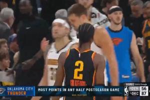 體育資訊05月08日訊 NBA季后賽次輪G2,雷霆半場87-56領先掘金。