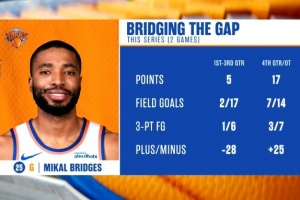 此役,尼克斯球員布里奇斯在43分鐘的時(shí)間里,投籃18中6,三分球8中2,拿到14分7籃板5助攻3搶斷的數(shù)據(jù)。