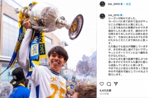 昨日田中碧更新社媒,曬出自己和球隊(duì)?wèi)c祝奪冠時(shí)的照片,并配文寫(xiě)道: