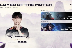 體育資訊5月8日訊 LCK常規(guī)賽T1以2-0橫掃DRX,F(xiàn)aker兩局合砍25/3/10的戰(zhàn)績(jī),拿下本場(chǎng)系列賽的MVP。