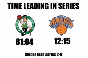系列賽兩場比賽常規(guī)時間加上一個加時共101分鐘,凱爾特人領(lǐng)先了81分04秒,而尼克斯只領(lǐng)先了12分15秒的時間,但是拿到兩場比賽勝利的都是尼克斯。