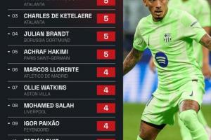 據(jù)Squawka數(shù)據(jù)統(tǒng)計,本賽季截止目前歐冠助攻排名榜: