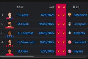 體育資訊5月9日訊 據(jù)StatMuse FC的數(shù)據(jù)統(tǒng)計,本賽季歐洲五大聯(lián)賽,已經(jīng)有5名球員貢獻單場2球+2助攻,最近一次是費爾明-洛佩斯。