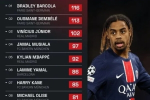 數(shù)據(jù)統(tǒng)計顯示,本賽季歐冠在對手禁區(qū)內(nèi)觸球次數(shù)方面,巴黎有兩名球員排名前列,其中,巴爾科拉116次第一,登貝萊113次第二。
