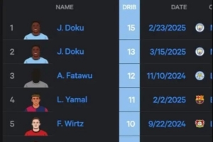 體育資訊5月9日訊 StatMuse FC統(tǒng)計(jì)本賽季五大聯(lián)賽單場過人次數(shù)排行,曼城邊鋒多庫占據(jù)前二,亞馬爾第四。