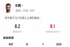 體育資訊5月9日訊 歐聯(lián)杯半決賽次回合,曼聯(lián)4-1畢爾巴鄂競技。B費首發(fā)出戰(zhàn),貢獻(xiàn)1次助攻,送出3次關(guān)鍵傳球,還有4次搶斷,評分8.2。