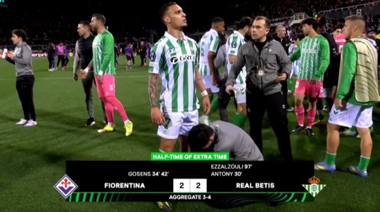 體育資訊5月9日訊 貝蒂斯vs佛羅倫薩加時半場休息,貝蒂斯隊醫(yī)專人為安東尼按摩放松左腿!本場比賽安東尼已經世界波+傳射建功!