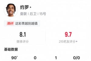 體育資訊5月9日訊 歐聯(lián)杯半決賽次回合,曼聯(lián)4-1畢爾巴鄂競技,總比分7-1晉級決賽。本場比賽約羅首發(fā)出戰(zhàn),送出1次助攻,還有2次關(guān)鍵傳球,4次解圍,2次搶斷,評分8.1。