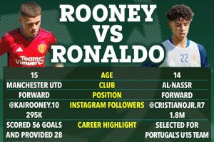 本周葡萄牙足協(xié)公布了新一期U15國(guó)家隊(duì)的名單,C羅的兒子,效力于利雅得勝利青年隊(duì)的克里斯蒂亞諾-多斯-桑托斯(迷你羅)入選。而C羅老隊(duì)友魯尼的兒子同樣天賦異稟,《太陽(yáng)報(bào)》將兩人放在一起對(duì)比。