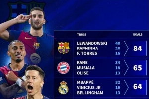 1、巴薩:萊萬(40球)+拉菲尼亞(28球)+費蘭(16球):84球