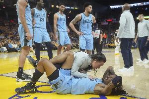 在上一場(chǎng)對(duì)陣勇士的比賽中,莫蘭特在一次撤步跳投落地崴腳痛苦倒地,隨后吃上止疼藥堅(jiān)持上場(chǎng)。