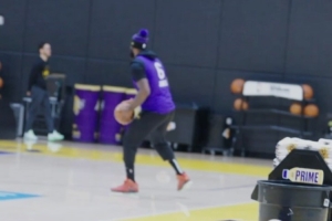 湖人前鋒詹姆斯在球隊(duì)訓(xùn)練結(jié)束后加練投籃,他重點(diǎn)練習(xí)了運(yùn)球后出手三分。