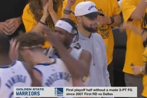 勇士上半場比賽三分5投0中,上次勇士季后賽半場無三分進(jìn)賬已是18年前,2007年首輪對陣達(dá)拉斯小牛(現(xiàn)獨行俠),G2下半場勇士三分4中0。