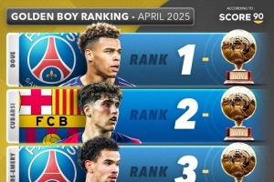 體育資訊4月19日訊 Score90列出了2025年金童排名,巴黎邊鋒杜埃居首,庫(kù)巴西、扎伊爾-埃梅里二三位。