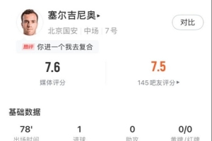 體育資訊4月19日訊 中超第8輪,北京國(guó)安對(duì)陣山東泰山,塞爾吉尼奧首發(fā)出戰(zhàn)78分鐘打進(jìn)一球,獲評(píng)7.6分。
