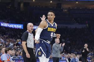 比賽最后24秒,威少左側(cè)底角命中一記關(guān)鍵三分幫助掘金把比分反超。