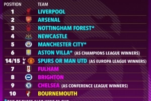 若英超積分榜從現(xiàn)在到賽季結(jié)束保持不變,目前前5名利物浦、阿森納、諾丁漢森林、紐卡和曼城都將直接晉級歐冠正賽。
