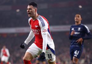 體育資訊4月20日訊 英超第33輪,阿森納客場(chǎng)挑戰(zhàn)伊普斯維奇。上半場(chǎng)槍手2比0領(lǐng)先,其中特羅薩德和馬丁內(nèi)利分別建功。這是馬丁內(nèi)利為阿森納各項(xiàng)賽事打進(jìn)的第50粒進(jìn)球。