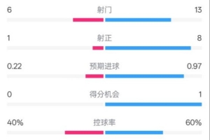 富勒姆1-2切爾西數(shù)據(jù):射門6-13,射正1-8,控球率40%-60%