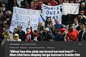體育資訊4月20日訊 英超第33輪曼聯(lián)坐鎮(zhèn)老特拉福德0-1輸給了狼隊(duì),紅魔吃到本賽季聯(lián)賽第15場(chǎng)敗仗。比賽中,主場(chǎng)球迷用拉橫幅的方式向俱樂(lè)部老板之一拉特克利夫爵士表達(dá)了抗議。