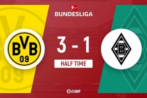 上半場(chǎng)比賽結(jié)束,多特蒙德3-1門興。